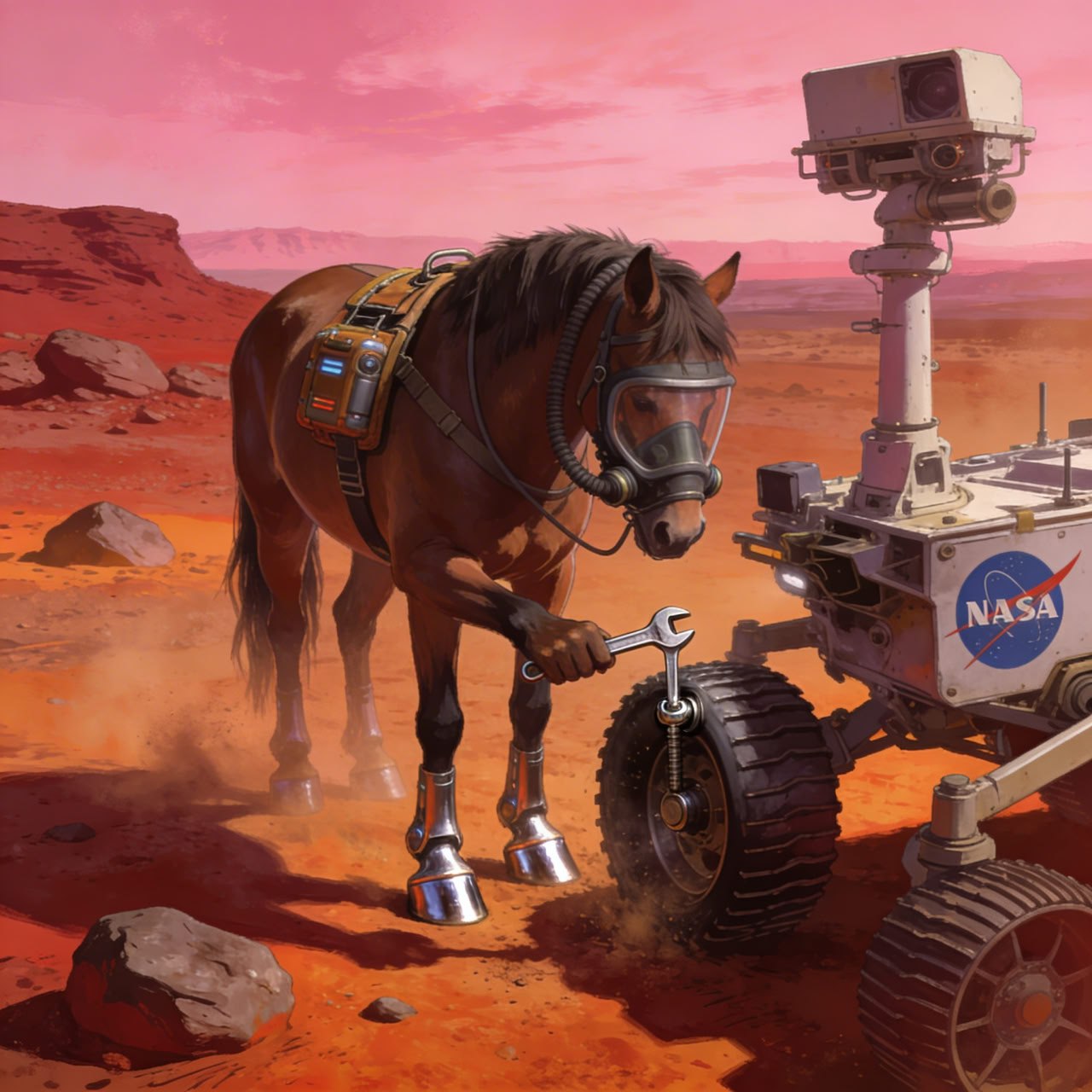 Picture a horse on Mars doing maintenance of the martian NASA rover.