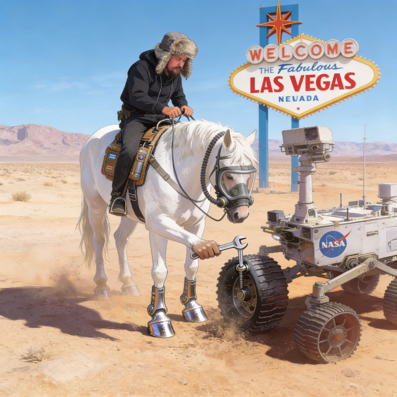 Me on a white horse doing maintenance of the NASA rover in a deserts of Nevada. Las Vegas sign stands nearby. 0.04$